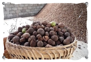 Nach etwa 4 Wochen schickt man die Helfer los und von Hand werden die Früchte gesammelt und zur Produktion gebracht (sehr abenteuerlich in China, mit Körben, Säcken, Handkarren, klapprigen Pickups oder auf dem Fahrrad werden die Nüsse transportiert und das alles ohne TÜV).